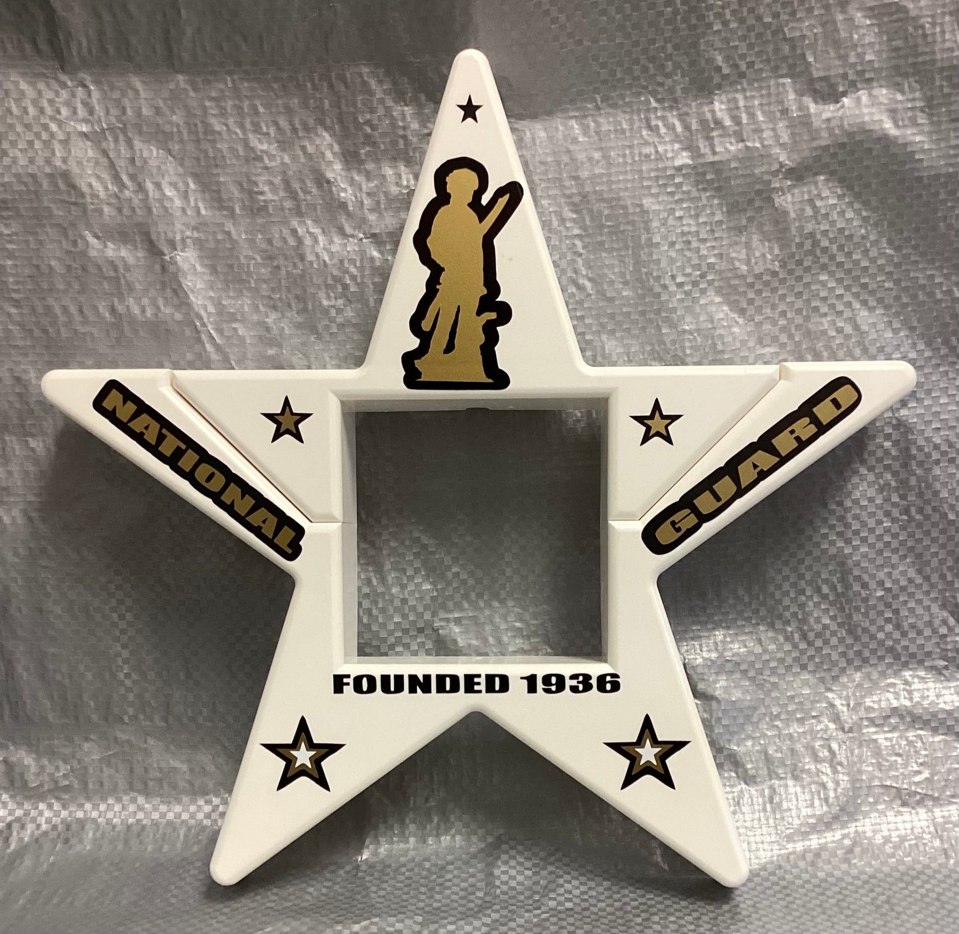 National Guard Star> Top & Base decorated with the appropriate color vinyl or as requested. Please use the INSTRUCTION BOX for the details. The body is made of ABS plastic with a UV stabilizer to protect the product from outdoor elements. The vinyl is Oracal 651. All products ship within 48 hours via USPS Ground Advantage or USPS 2–3-day Priority mail. MADE in the USA, Color and Design may vary.